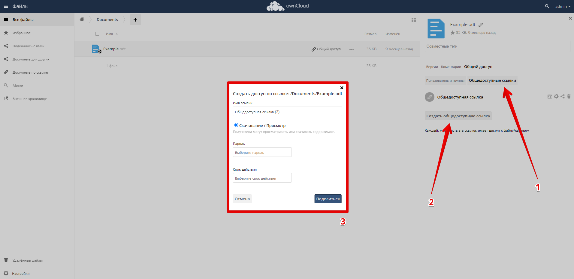 Если пользователь не авторизован, предоставить ему доступ можно по ссылке. Для этого на соседней вкладке «Общедоступные ссылки» нажмите «Создать общедоступную ссылку». В открывшемся окне можно указать название ссылки, пароль доступа и срок действия, после которого открытие документа по данной ссылке будет недоступно.