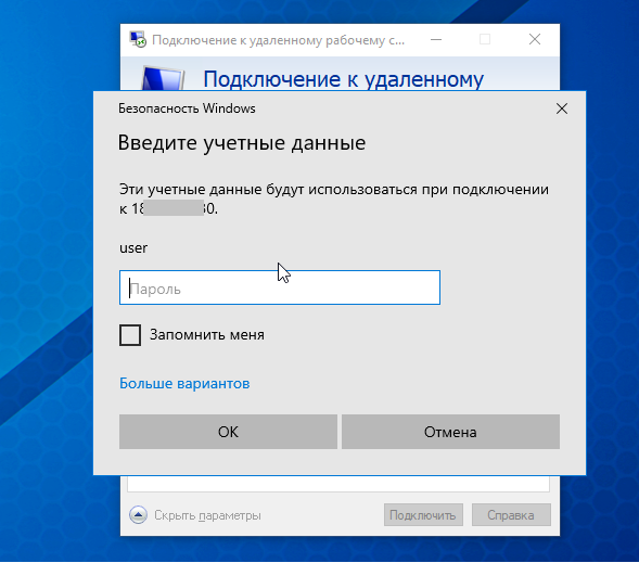 3) Открывается окно Подключения к удаленному рабочему столу. Вводим имя хоста (в нашем случае - основной IP из активационного письма) и имя пользователя.