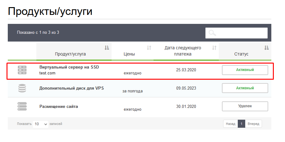Выберете виртуальный сервер, к которому вы хотите подключить дополнительный диск (меню «Аккаунт», «Продукты/услуги»).