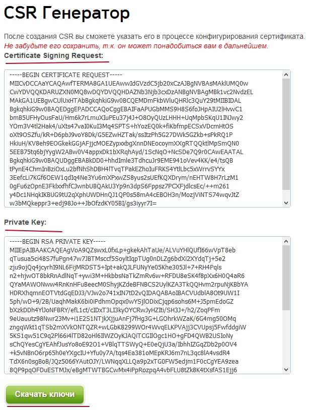 После того как вы сгенерировали CSR вы можете его скачать или просто скопировать полученный CSR код и Privet Key.